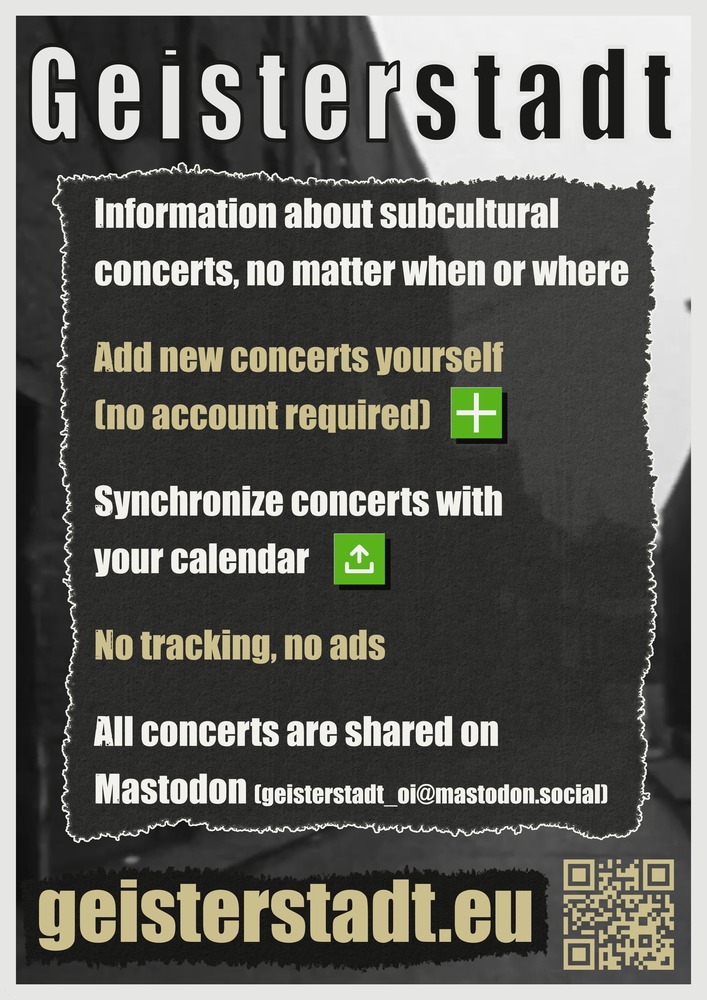 Facebook, Instagram and so on are annoying. The only good thing about them is all the information about upcoming subcultural concerts. Geisterstadt aims to collect all these events outside of these usual platforms and make them available in a simple and open way.