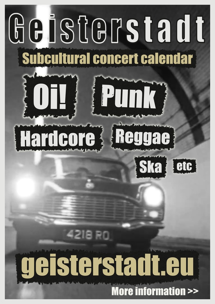 Geisterstadt is an open collection of concerts in the areas of Oi!, Punk, Hardcore and similar genres. Here everyone can easily find information about upcoming events.
